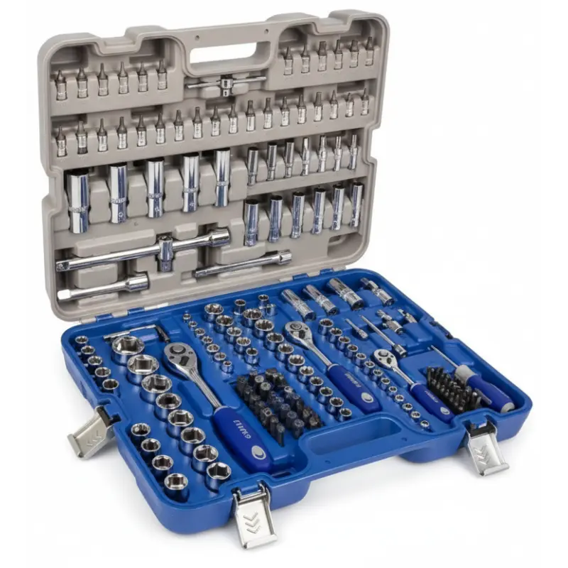 Incluye vasos métricos para ¼″, ⅜″ y ½″, carracas de liberación rápida, extensiones, adaptadores, vasos largos, puntas Torx, Allen y hasta vasos específicos para bujías. Todo organizado en un maletín rígido listo para aguantar el ritmo del día a día.