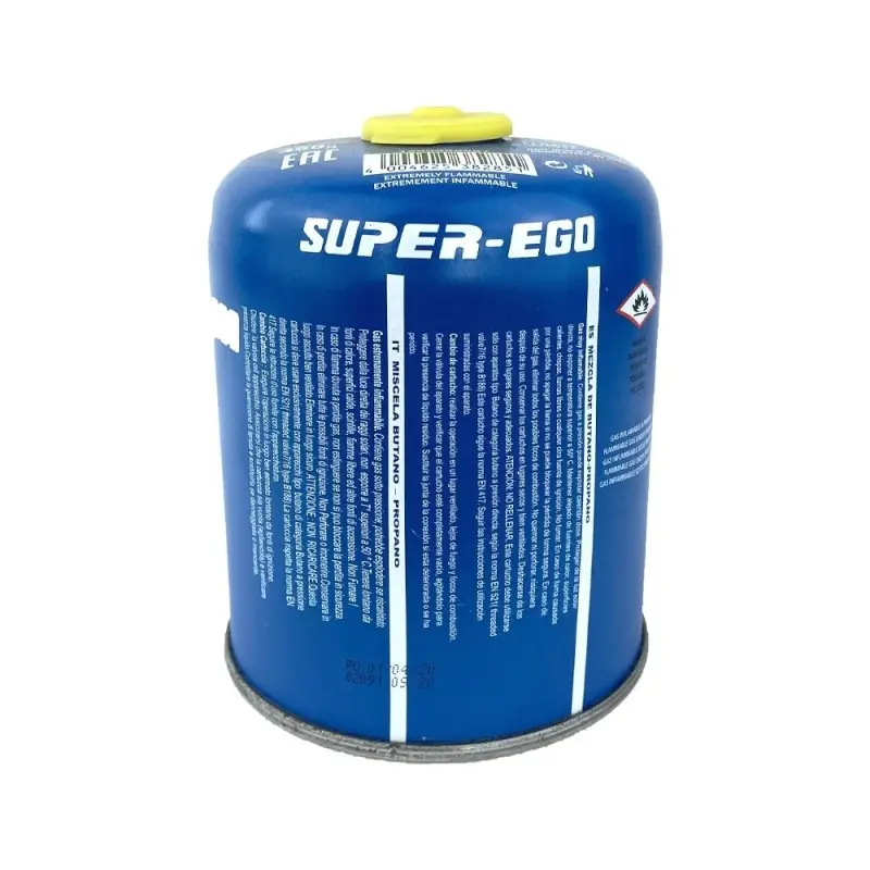 Cartucho de gas C 470 de Super-Ego con sistema de válvula. Contiene 450 gr de mezcla de butano y propano, especialmente recomendado para el funcionamiento a bajas temperaturas, ya que funciona hasta -10º C
