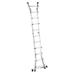 La escalera telescópica Escalísima de Svelt es una escalera multiposiciones con 8+8 peldaños y bandeja portaherramientas, fabricada en aluminio nervado extruido.