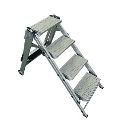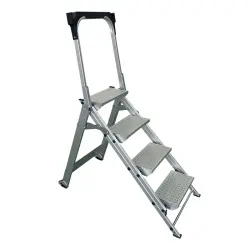 Taburete plegable con barandilla Record de Svelt fabricado en aluminio anodizado con peldaños de grandes dimensiones antideslizantes, barandilla guardacuerpo abatible, 2 ruedas y bandeja portaobjetos. Ideal para uso profesional.