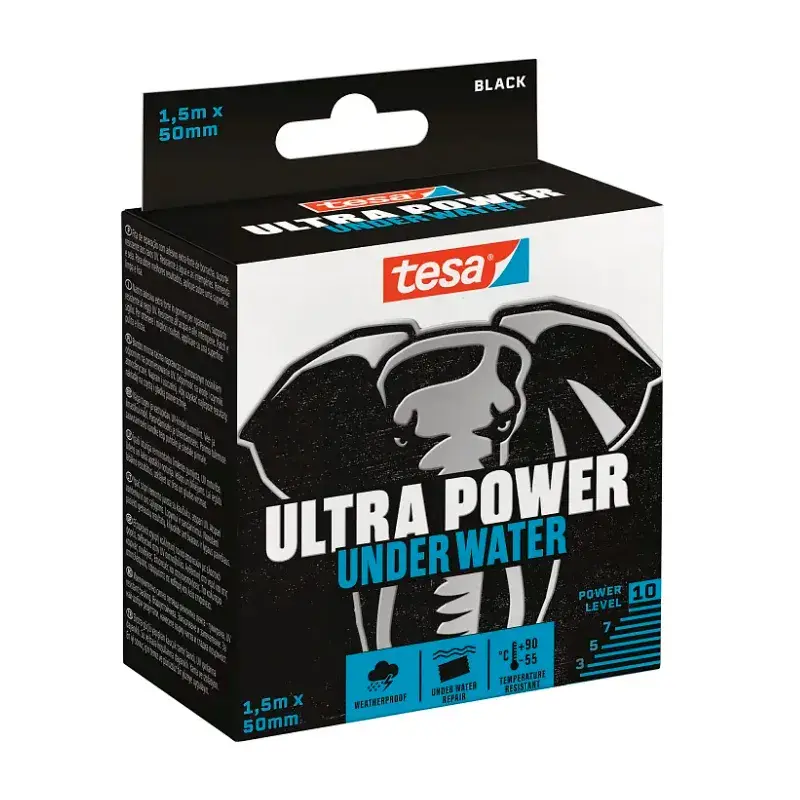 Cinta de reparación resistente al agua Ultra Power Superficies Mojadas de Tesa. Es una cinta de reparación duradera con una fuerte adherencia que es ideal para uso en exteriores. Es fácil de usar para una variedad de tareas como parchear agujeros, grietas, huecos y rasgaduras o sellar daños y fugas. Gracias a su alta resistencia a los rayos UV y a la temperatura, se puede utilizar incluso en condiciones climáticas extremas.