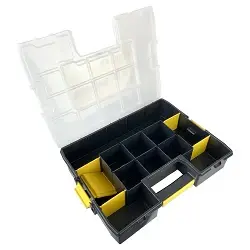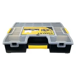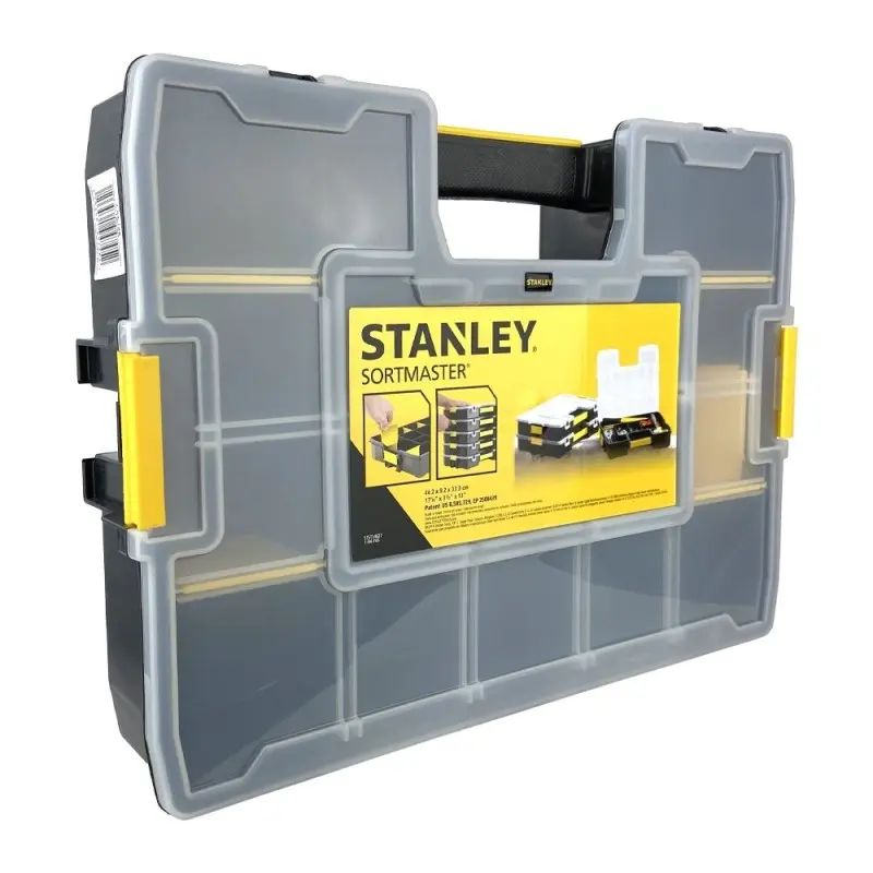 Estuche organizador Sortmaster de Stanley con compartimentos ajustables, lo que permite configurar distintos espacios de almacenamiento, así como combinar el almacenamiento de herramientas y piezas pequeñas.