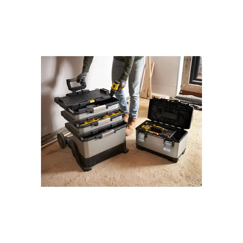 Está compuesto por una caja de herramientas de 20” con bandeja extraíble, dos cajones profundos de 10 cm con guías de precisión y un contenedor inferior de gran capacidad, lo que garantiza espacio suficiente para almacenar desde piezas pequeñas hasta maquinaria portátil. Sus cierres y bisagras metálicas antioxidantes aportan seguridad y durabilidad.