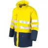 Parka bicolor de Alta Visibilidad 04634 en amarillo fluor y azul marino, con bandas reflectantes.